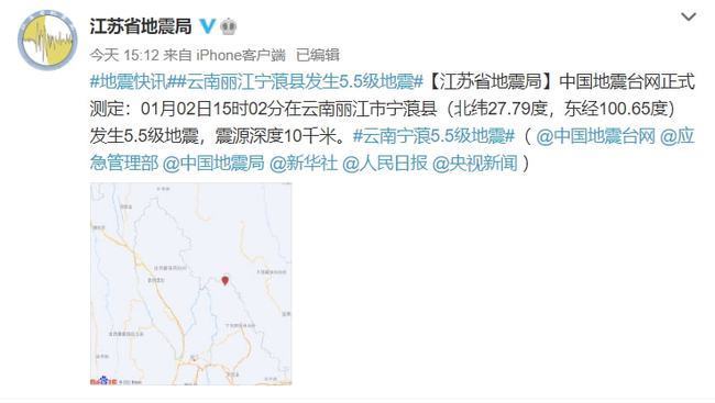 江苏省地震局对此次云南宁蒗地震也第一时间关注。